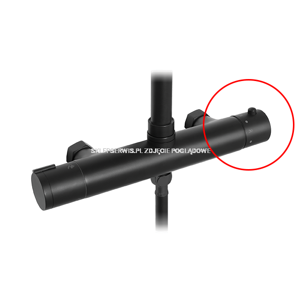 Pokrętło termostatu baterii do deszczowni Musta, które demontuje się poprzez odkręcenie śrubki znajdującej się pod zaślepką pokrętła.