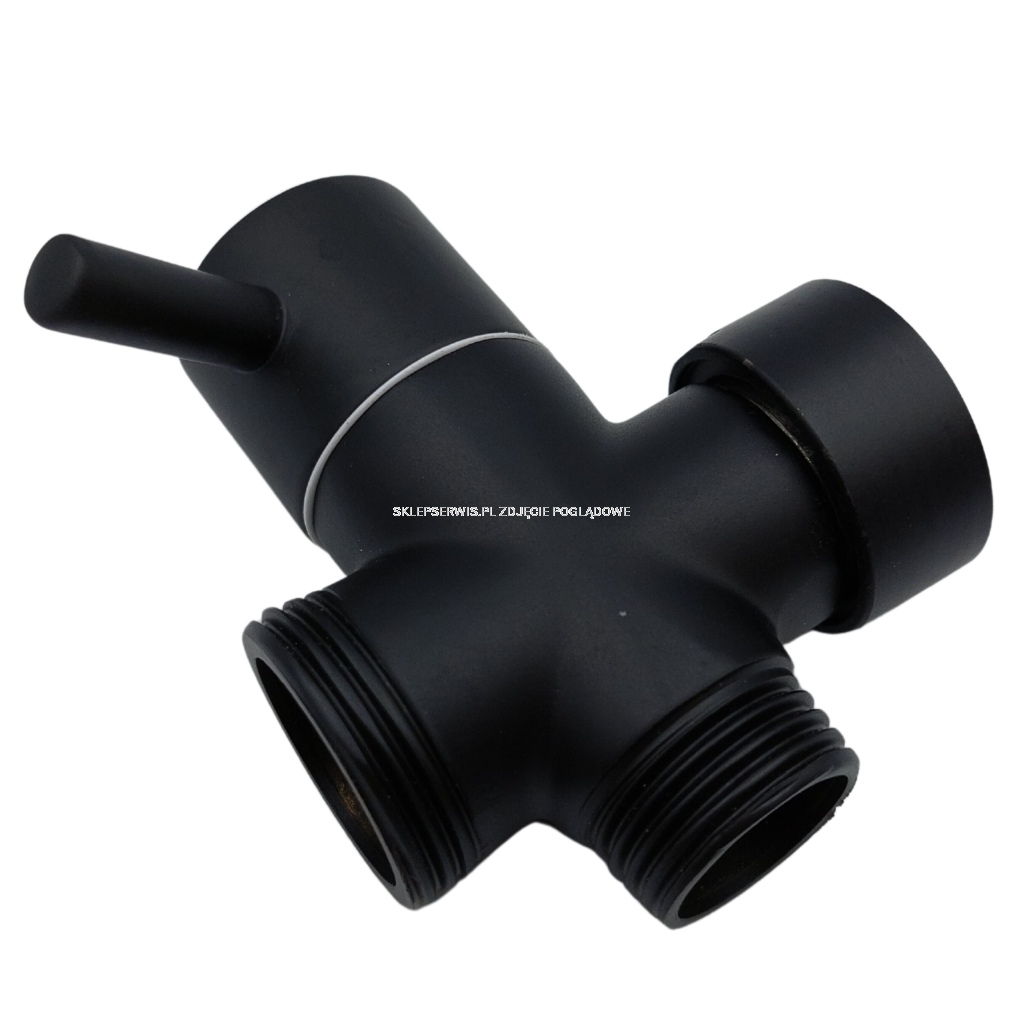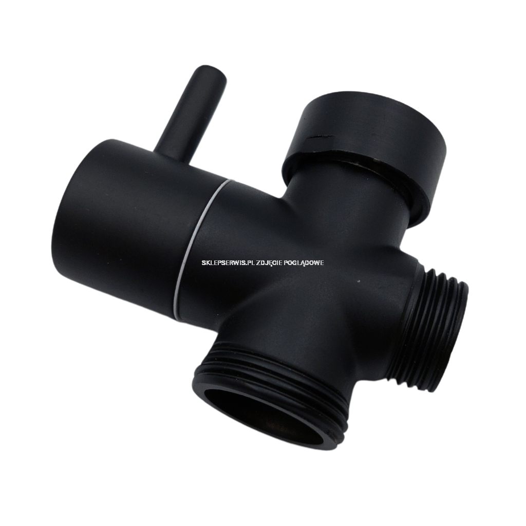 Czarny przełącznik funkcji do deszczowni Gracja, który posiada dwa gwinty 3/4 cala i jeden gwint 1/2 cala.