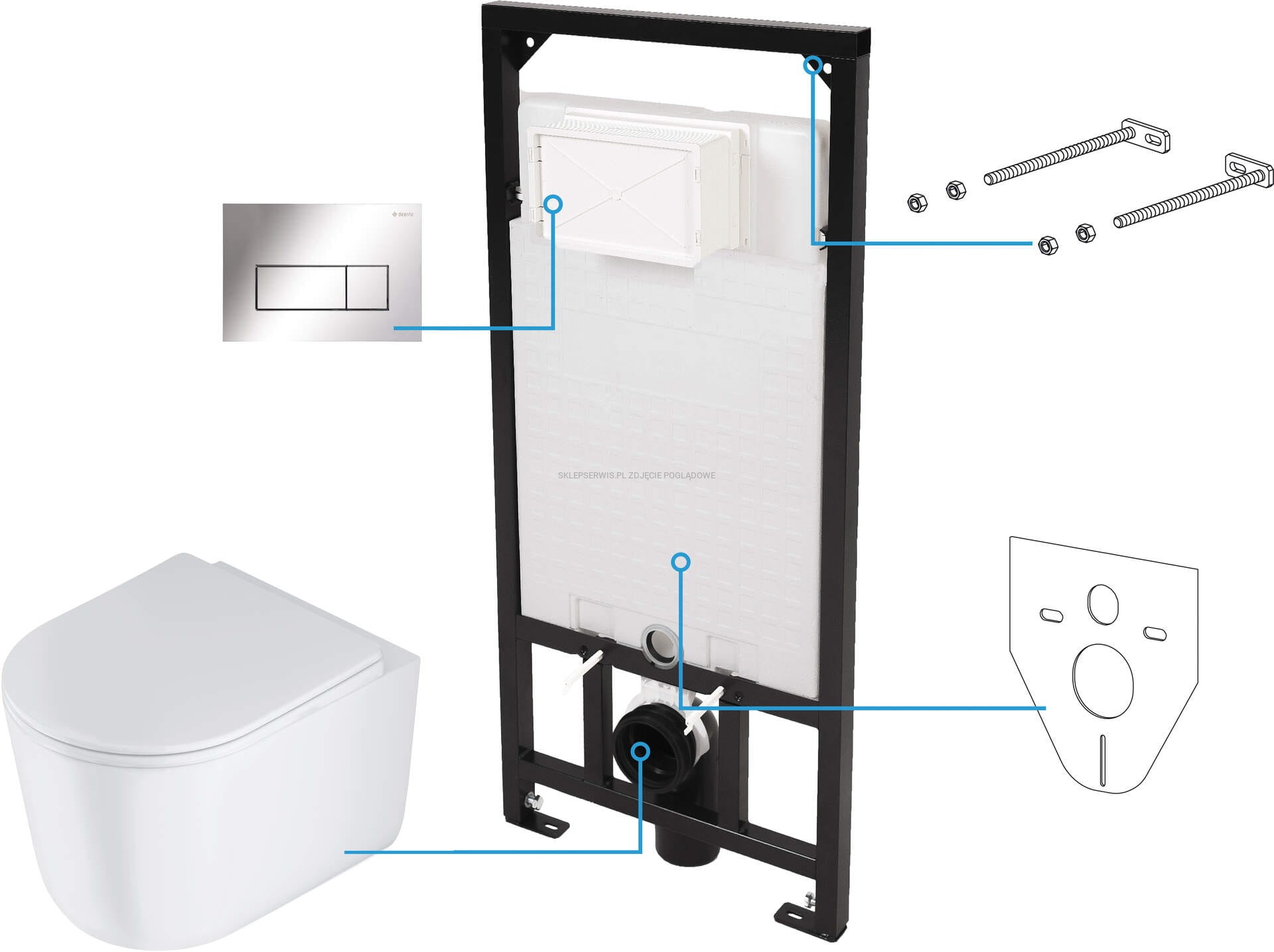 Zestaw WC z wiszącą miską pomyślany został z myślą o wysokiej estetyce pomieszczenia oraz łatwości sprzątania. Trwała ceramika wysokiej jakości nie pęka i nie zmienia koloru nawet po długim czasie użytkowania, co zostało potwierdzone badaniami Deante. Uniwersalny, klasyczny, biały kolor zestawu WC nadaje pomieszczeniu elegancji. Przystosowany do instalacji podtynkowych. Elegancko wykończony, ozdobi każdą łazienkę. Jest to kompletny zestaw 6 w 1, w skład którego wchodzi: stelaż podtynkowy, miska bezkołnierzowa WC, cicho opadająca deska, elegancki przycisk spłukujący, mata amortyzująca i śruby montażowe.